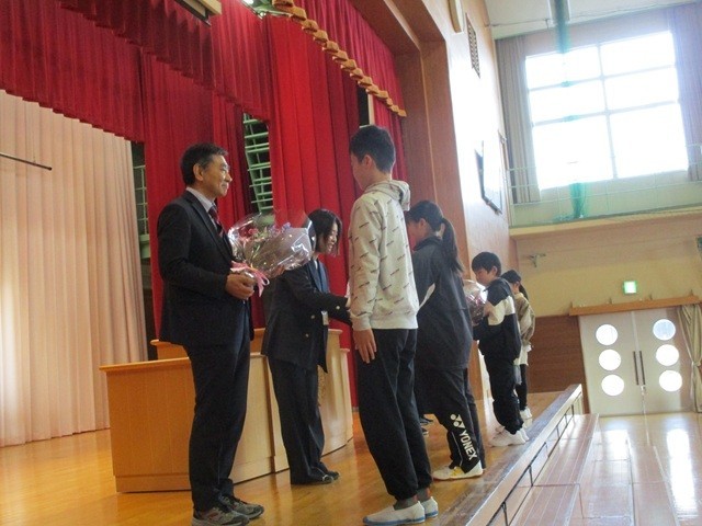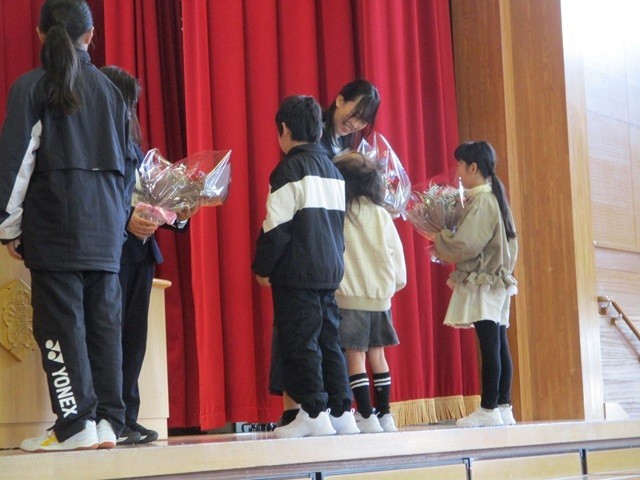 児童の代表がお礼の言葉を言って花束を渡しました。