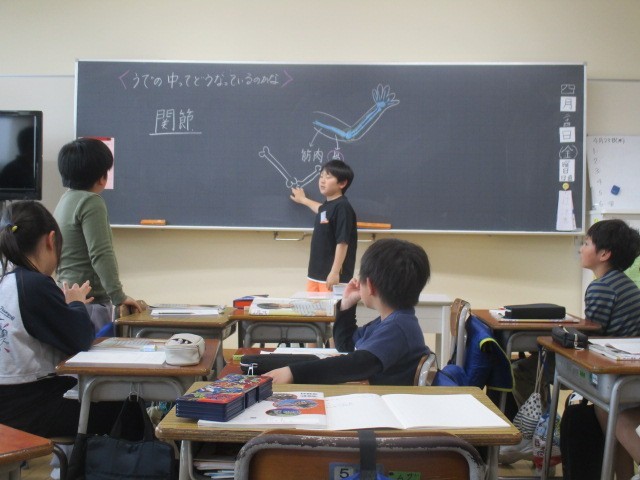 4年 理科 公開日 2026/04/23 更新日 2026/04/23 学校から 「関節」について考えました。仲間の話に耳を傾け、質問したりうなずいたりと、聴き合う姿が見られました。指の第2関節はどこかな?
