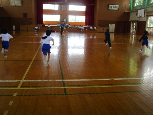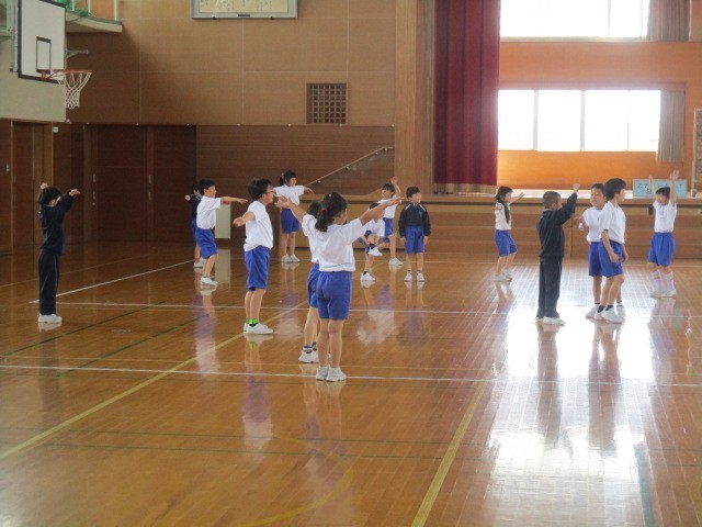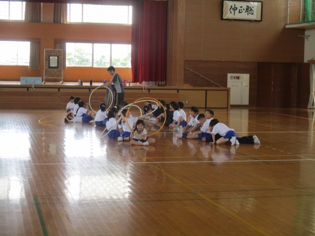 体つくり運動遊びです。片足立ちでバランスをとったり、フラフープを使って全身運動をしたりしました。