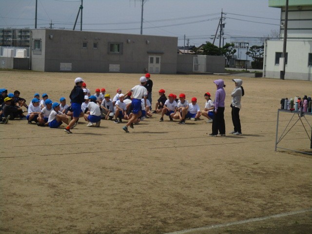 団対抗リレーの練習です。タイミングをはかって、素早くダッシュし、バトンをもらいます。