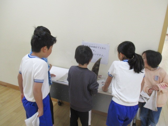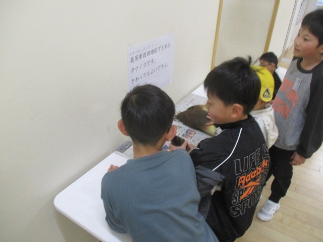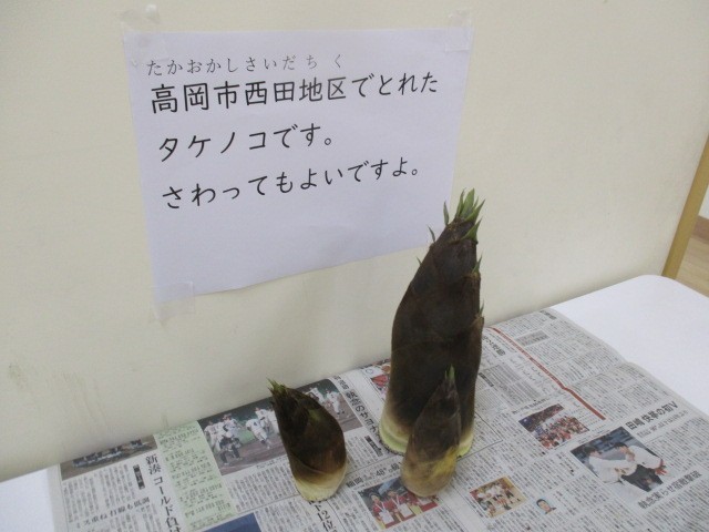 本物に触れる 公開日 2026/04/30 更新日 2026/04/30 学校から 高岡市西田地区で収穫されたタケノコを展示しました。「やわらかい!」「ふさふさしている。」「ばあちゃんちにもあるよ。」各々に感想を言ってくれました。