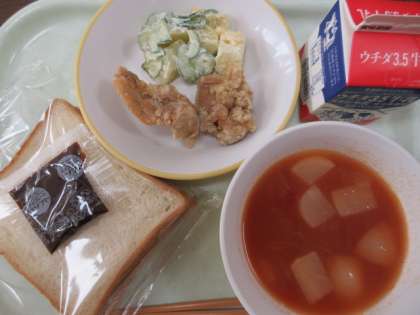 冬野菜のミネストローネ フライドチキン ポテトサラダ パン(チョコレートクリーム)