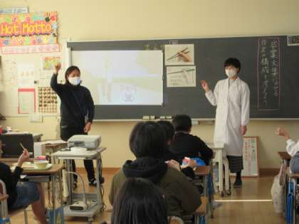 給食の時間に、栄養士さんが各教室を回り、正しい箸のもち方を指導してくださっています。