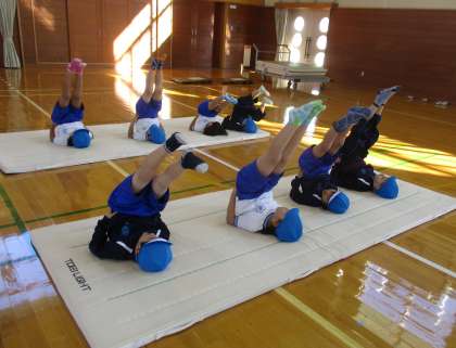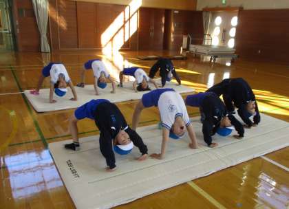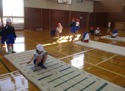 体育科の学習でマット遊びを始めました。「ゆりかご」や「アンテナ」「ブリッジ」、前転がりなどをしています。目当ては、「くるんと後ろ回り」です。いろいろな運動に、みんな楽しそうに取り組んでいます。