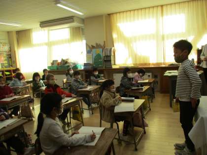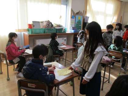 そこで、今日は「おもちゃランド」の招待状をもって1年生教室に行き、招待状を渡しました。子供たちは緊張しながらも、「明日楽しみにしててね」や「ぜひ私のおもちゃのところに来てね」などと話しながら、仲良しのファミリー班の1年生に招待状を渡していました。