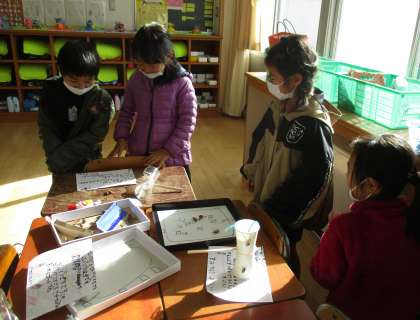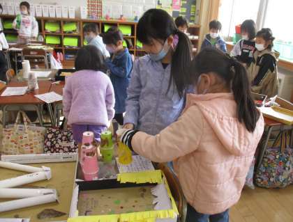 2年生に「おもちゃランド」に招待してもらった後、自分たちでも作った秋のおもちゃで、お店やさん役とお客さん役に別れて「秋のおもちゃやさん」をしました。来てくれた友達におもちゃの遊び方を優しく教えたり、友達のおもちゃを興味深そうに試したりして楽しく遊びました。