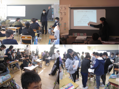 県外から講師をお招きし、和合地区教育文化後援会主催の「主体的な学び」公開研修会を開催しました。4、5年生のクラスでは、講師の方が授業者として、思考ツールを使って、自分の考えを筋道立てて組み立てる方法を学習しました。授業の後半は、チャート上で組み立てた主張を伝え合う活動を行い、振り返りをしました。