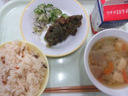 ごもくごはん 魚のいそべあげ ゆかり和え みそけんちん汁