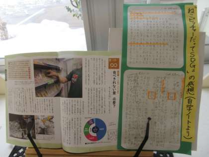 本日、全校児童がSDGsの冊子を持ち帰りました。1月中に、3年生以上の子供たちは、学校で読んだり、自主学習ノートに感想を書いたりしていました。校長室前にも掲示しています。(写真は4年生の感想です)