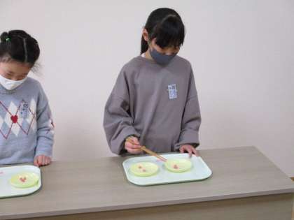 4年生で正しい箸使いができる人の中から、2名の代表の子供が校長先生の前で箸使いを披露しました。みんな、毎日、教室で練習しています。