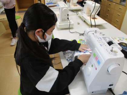 家庭科の学習で、ミシンを使ってバンダナ巾着を作りました。