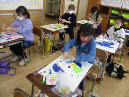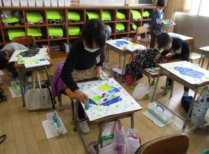 「お気に入りのかお」の紙版画が刷り上がり、顔の周りにいろいろな材料で型押し遊びをしました。たんぽやプリンカップ、野菜の断面などに好きな色をつけてスタンプをしました。みんなとても楽しそうでした。