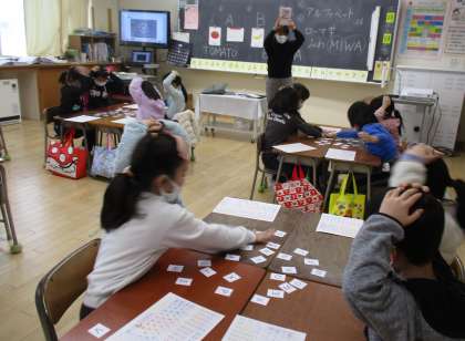 もうすぐ一人1端末のパソコンが届くということで、1年生も少しABCのアルファベットに親しむ学習をしました。校長先生に読み方を教えてもらい、音楽に合わせて唱えてから、ABCカードでアルファベットを見つけました。最後には、ABCカルタで遊びました。ABCカードを持ち帰ったので、家でもアルファベットを読んだり、見つけたりできるといいですね。