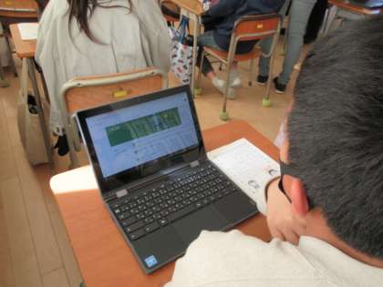5年生は、自分で考えたパスワードを入力し、ホームページ等の検索やクラスルームの使い方を学びました。早速、スプレッドシートでしりとりをし、みんなの入力の様子が一目で見られることに驚いていました。明日から10の約束を守って、活用していきましょう。