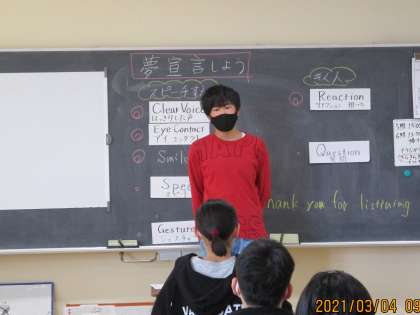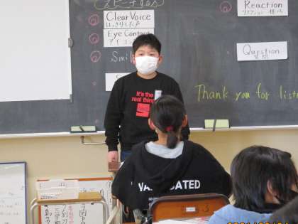 6年生の外国語科は、これが最終単元です。今まで学習してきた表現を用いて自分の夢や中学校でがんばりたいことをみんなの前でスピーチをしました。夢に向かうきっかけや理由を話す子供もいて、友達の夢を聞いている子供たちも真剣に聞いていました。英語で話すことが1年で上達しました。