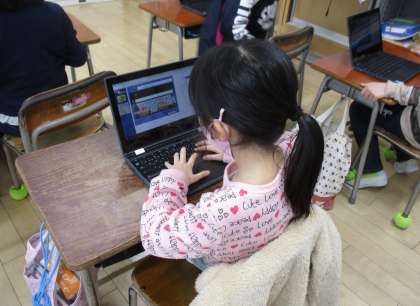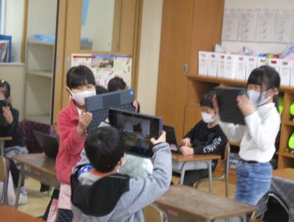 毎日クロムブックを使っているので、だんだん準備や片付けが上手になってきました。今日は、クロムブックをタブレットの形にして友達や自分の写真を撮ったり、キーボー島アドベンチャーで入力の練習をしたりしました。分からないときは、教え合いながら楽しそうに操作していました。