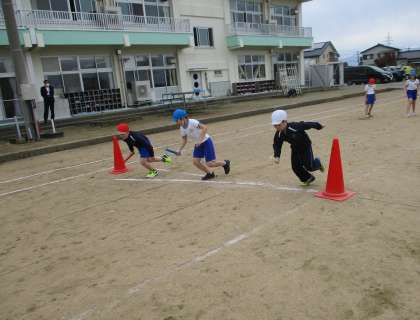 体育科の学習でリレーの練習を始めました。3年生からは、リングバトンではなく棒のバトンを使って一人一人がグラウンド半周を走ります。バトン渡しにはまだ慣れませんが、バトンをもらうと一人一人が力一杯走っていました。