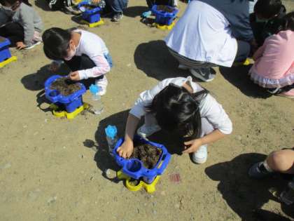 あさがおの種を植えました。植える手順を確かめながら、丁寧に種を植えていました。どんな色のあさがおが咲くか楽しみにしている子や大きく育ってほしいとお願いをしている子など、みんないろいろな思いをもって、植えました。これからお世話をがんばりましょう。