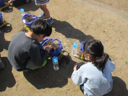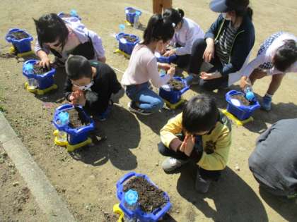 あさがおの種を植えました。植える手順を確かめながら、丁寧に種を植えていました。どんな色のあさがおが咲くか楽しみにしている子や大きく育ってほしいとお願いをしている子など、みんないろいろな思いをもって、植えました。これからお世話をがんばりましょう。