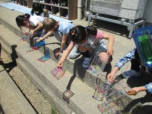 今日は透明容器に光を通して、様々な形や色をつくりました。自分の好きな色からどんどん塗り進める子や、どんな風に映るか試しながら塗っている子、自分で作品のテーマを決めて塗っている子など、思い思いに作品づくりを楽しんでいました。