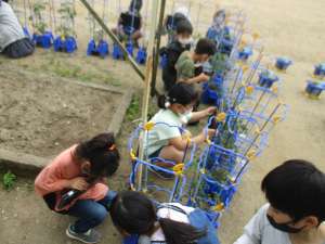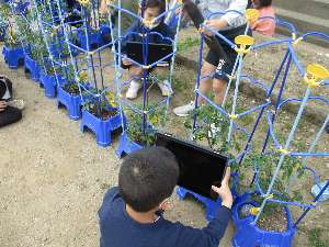 今日はミニトマトの観察をしました。黄色い花が生えているものや、もう緑色の小さい実ができているものもありました。自分がみんなに一番見てほしいところを選んで、写真を撮りました。