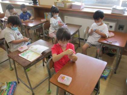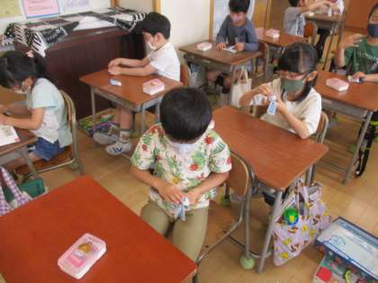 算数では、たしざんの学習をしています。今日は、たしざんカードを使って、たしざんの練習をしました。式を順番に言って答えが合っているとうれしそうでした。これから、すらすら言えるように、練習をがんばっていきましょう。