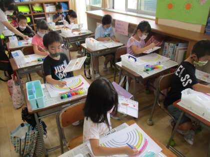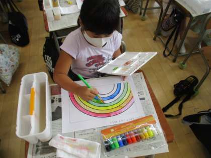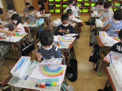 図工で、水彩を使って色塗りをしました。初めての水彩で、水の量や色の混ぜ方に気を付けながら、色を塗りました。今日は、虹に色を塗りました。子供たちは、きれいな虹にしようと、自分の納得のいく色を作って、丁寧に塗っていました。