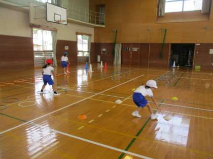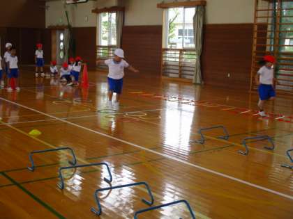 体育では、ミニハードルやラダーを使って、いろいろな走り方に挑戦しています。初めはなかなかリズムよく走ることができませんでしたが、何回も繰り返すと上手に走ることができるようになってきました。また、できる子は、もっと速くできるようにがんばっています。これからもいろいろな走り方を練習していこうと思います。