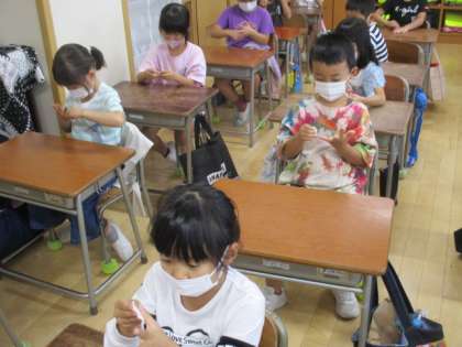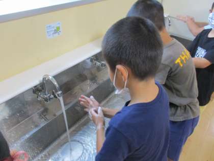 最後に実際に手を洗ってみました。スタンプを手に付けて、スタンプが落ちるように丁寧に手を洗っていました。子供たちは、手がきれいになったと嬉しそうでした。これからも、手洗いをしっかりしていきたいと思います。