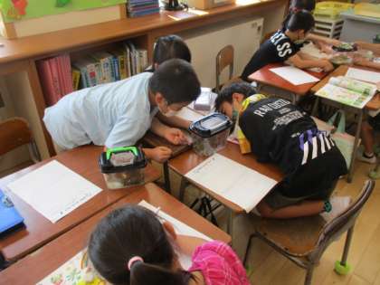 生活科の学習で、見付けた生き物の観察をしました。これまで朝顔の観察で色や形、大きさ、模様などを見て描くことを学習してきたので、今回も詳しく描こうとじっくり見ていました。さらに生き物なので、動きにも注目している子もいて、子供たちは生き物が動く様子に釘付けでした。