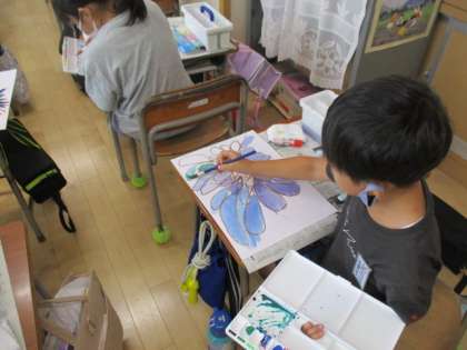図画工作科では、「せかいに一つだけのはな」の学習をしています。今日は、前回クレヨンで描いた花に、水彩で着色しました。2回目の水彩でしたが、子供たちは使い方をしっかり覚えており、上手に塗っていました。また、世界に一つだけの色になるよう、色や水の量を変えて自分で色を作っていました。きれいな色ができると「こんな色になったよ。」と嬉しそうに塗っていました。