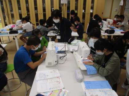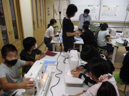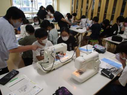 ミシンが2本の糸を使って縫う様子や、上下の糸のかけ方、布の送り方等初めてのことに緊張しながらも、練習布を丁寧に縫っていました。