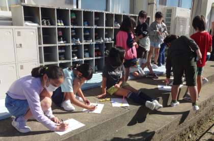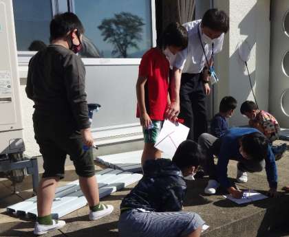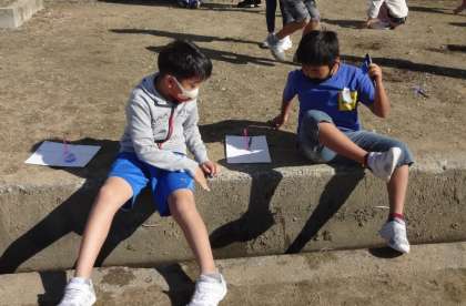 理科の学習で太陽と影の向きについて調べました。方位磁針の使い方を確認したあと、外に出て画用紙に映った影をマジックでなぞり記録を取りました。この後、結果を基に分かったことをまとめていきます。
