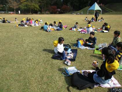お昼は、ピクニック広場でお弁当を食べました。朝の天気は少し不安でしたが、お昼にはとてもよく晴れ、外でお弁当を食べることができました。子供たちは、おいしそうにお弁当を食べていました。