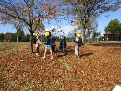 お昼の後は、秋見付けをしたり、広場で遊んだりしました。落ち葉を見付けて遊んだり、どんぐりをたくさん拾ったり秋を楽しんでいました。また、大きな遊具もたくさんあり、子供たちは思いっきり体を動かして楽しそうでした。