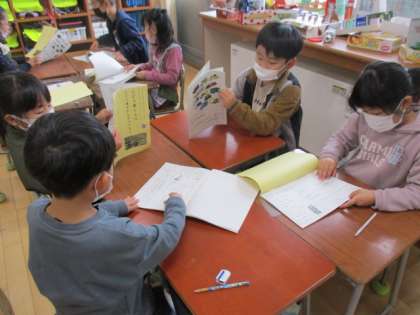 また、友達の図鑑を見合いました。子供たちは、友達がかいた図鑑も楽しみながら見ていました。
