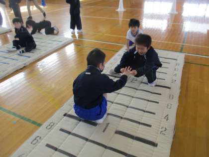 体育科では、マット運動遊びをしています。今日は、背中支持倒立やゆりかごじゃんけんや前転がりをしました。高く足を上げて少しでも止まれるようにとがんばったり、ゆりかごをしながらじゃんけんを楽しんだりするなど、一生懸命に取り組んでいました。前転がりは、難しそうだと言いながらも、挑戦する姿が見られました。少しずつマット運動の技に挑戦していこうと思います。
