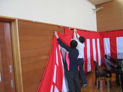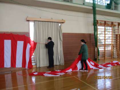 始業式が終わった後の体育館では、教職員が協力して、明日の入学式の準備をしています。
