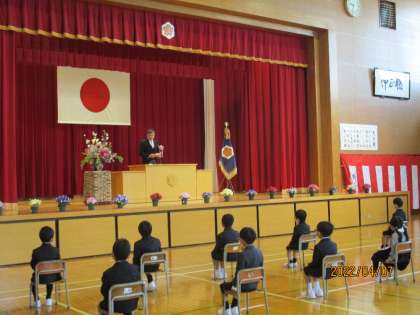 新1年生の子供たちは、校長先生の方を向いて、しっかりとお話を聞いていました。