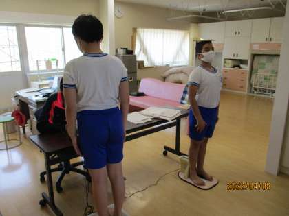 今日は5・6年生の発育測定を行いました。 「伸びてるかな」「身長縮んどるかも・・・」 どきどきの発育測定でした。