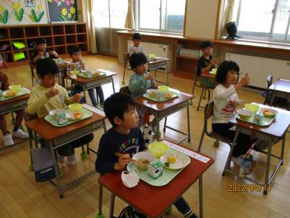 初めての学校給食 公開日 2022/04/11 更新日 2022/04/11 1年 1年生の子供たちにとっては、小学校で食べる初めての給食です。 担任の先生と、おはしの持ち方を確認しながら、おいしくいただきました。