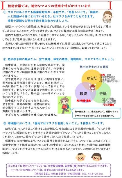 配付文書にも載せてあります。ご確認ください。富山市立学校新型コロナウイルス感染症対策検討会だよりVOL.18