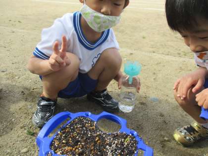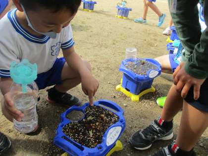 朝、水やりをしている時に、「あさがおが出ていた!」と歓声が上がりました。