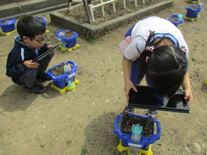 見ると、いくつかの子の朝顔の芽が、ひょっこりと顔を出していました。芽が出て、とても嬉しそうでした。生活科の時間には、クロムブックで芽の写真を撮りました。
