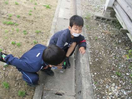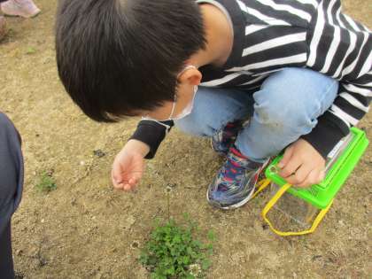 友達と誘い合いながら、グラウンドに出て、草原や木陰などを探しました。だんごむしやてんとうむし、幼虫、シロツメクサ等、様々な生き物を見付けることが出来ました。