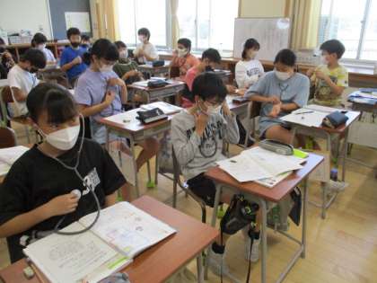 理科では、「動物のからだのはたらき」の学習をしいます。今日は、血液のはたらきについて考え、栄養や酸素は、血液によって全身に運ばれることを学びました。また、心臓が動くことで血液が全身に流れることも学習し、脈拍数と心臓の拍動数を比べてみました。聴診器を使って、自分の拍動を聞いてみました。子供たちは、真剣に拍動を聞いていました。