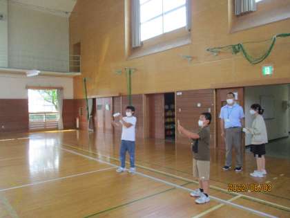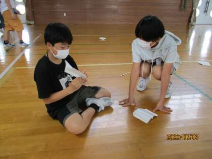 始めは上手く飛ばなかった紙飛行機も、羽の角度や先端の重みを調節しながら、うまく飛ぶように工夫して上手に飛ばしていました。