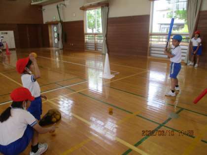 初めてバットを持ってボールを打った子供もいました。野球のクラブに所属している子供に振り方のコツを教えてもらいながら子供たちで工夫してバットを振っていました。これから体育の授業でソフトボールを続けていく中で自分たちで考えて、バットの投げ方ゲームの仕方を工夫してほしいです。
