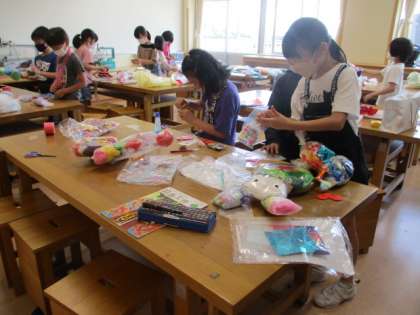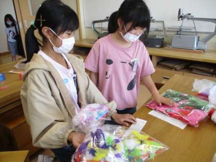 図工でカラフルなものを作りました。休み時間に作った物で遊んだり、持って帰って使うことができるクッションなど自分たちで作りたい物を考えて楽しんで作っていました。