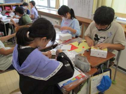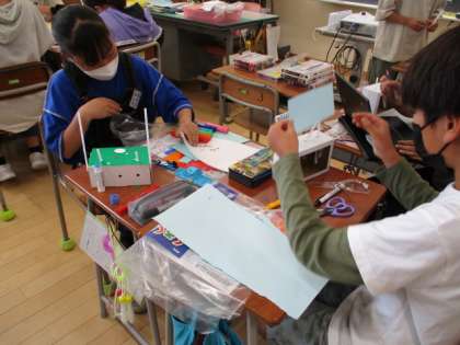 図画工作科では、「くるくるクランク」の学習をしています。クランクの仕組みを使って、動くおもちゃづくりをしています。クランクの動きを試しながら、何がどのように動いたらおもしろいかを考えながら、作りました。子供たちは、試行錯誤しながら一生懸命に作っていました。どんな作品ができあがるか、楽しみです。